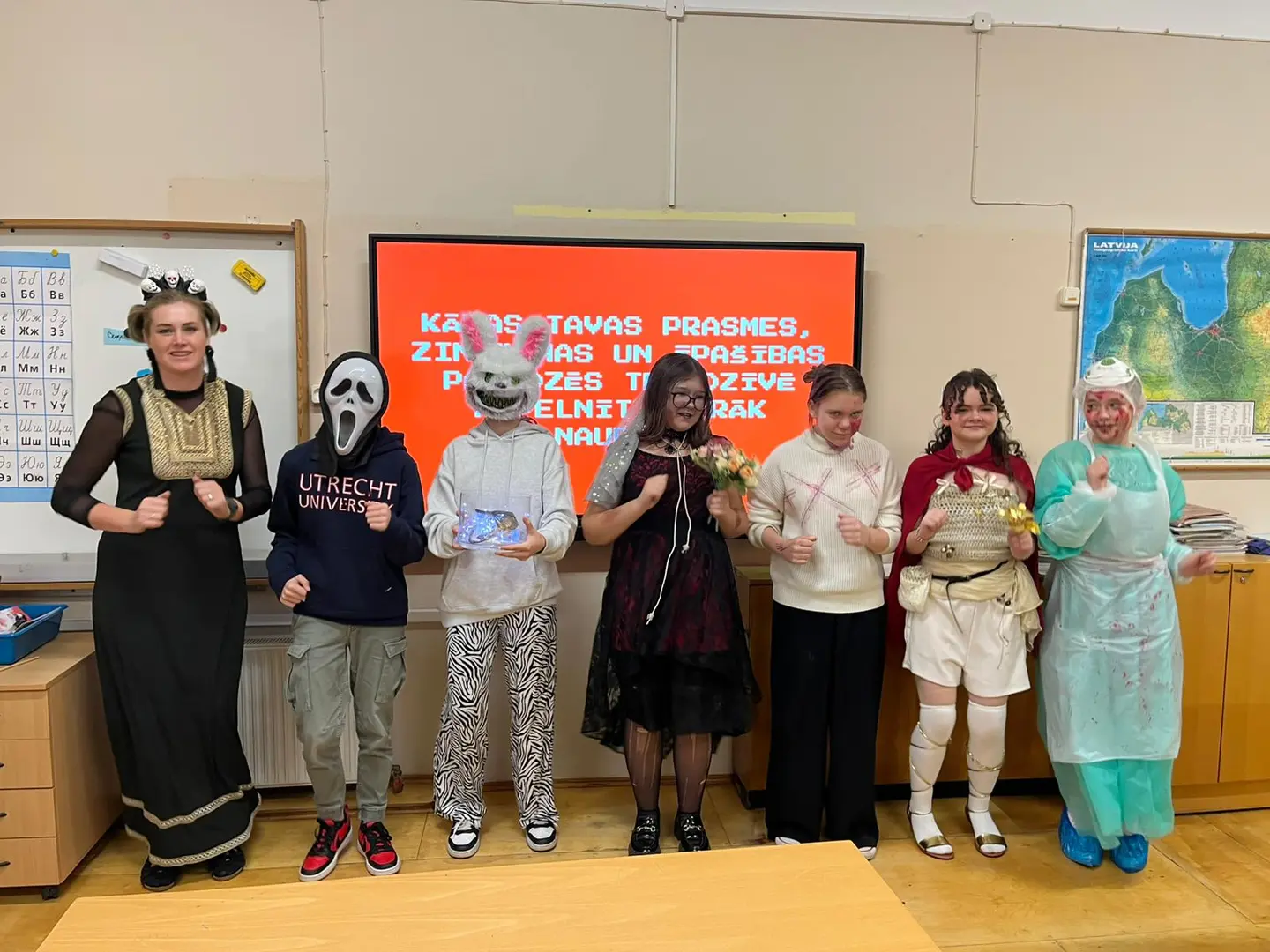 Skolēni un skolotāji bija tērpušies dažādos interesantos, jautros un reizēm pat biedējošos kostīmos. Gaiteņos varēja sastapt raganas, skeletus, ķirbjus, supervaroņus un citus pārsteidzošus tēlus.